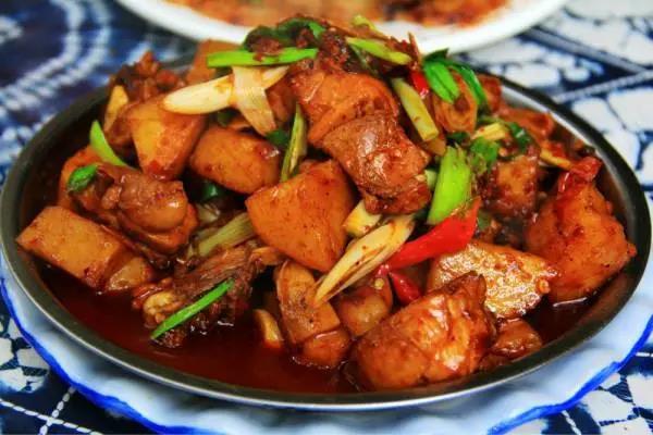 在當(dāng)?shù)卮髲N看來,做黃燜雞沒有什么訣竅,只需要兩個(gè)字:用心。雞選用永平當(dāng)?shù)氐牟┠仙酵岭u,堅(jiān)持活雞現(xiàn)宰,剁成 2 厘米大小的方塊;然后將干辣椒去把、除籽,切成長(zhǎng)節(jié);注入鍋內(nèi)的香油量要適中,將油燒熱,把花椒、姜、干辣椒放入鍋中炸成亮色,投入仔雞塊,加入適量的醬油、蔥、蒜等,翻炒幾下,蓋上鍋蓋,然后等待雞肉水分干而發(fā)黃,再放入自己調(diào)配好的佐料、蒜末和辣椒翻炒,最后加入適量大蔥便可起鍋;炒燜雞塊一定要掌握火候,只有用旺火炒后燜出來的才不會(huì)失去真味。